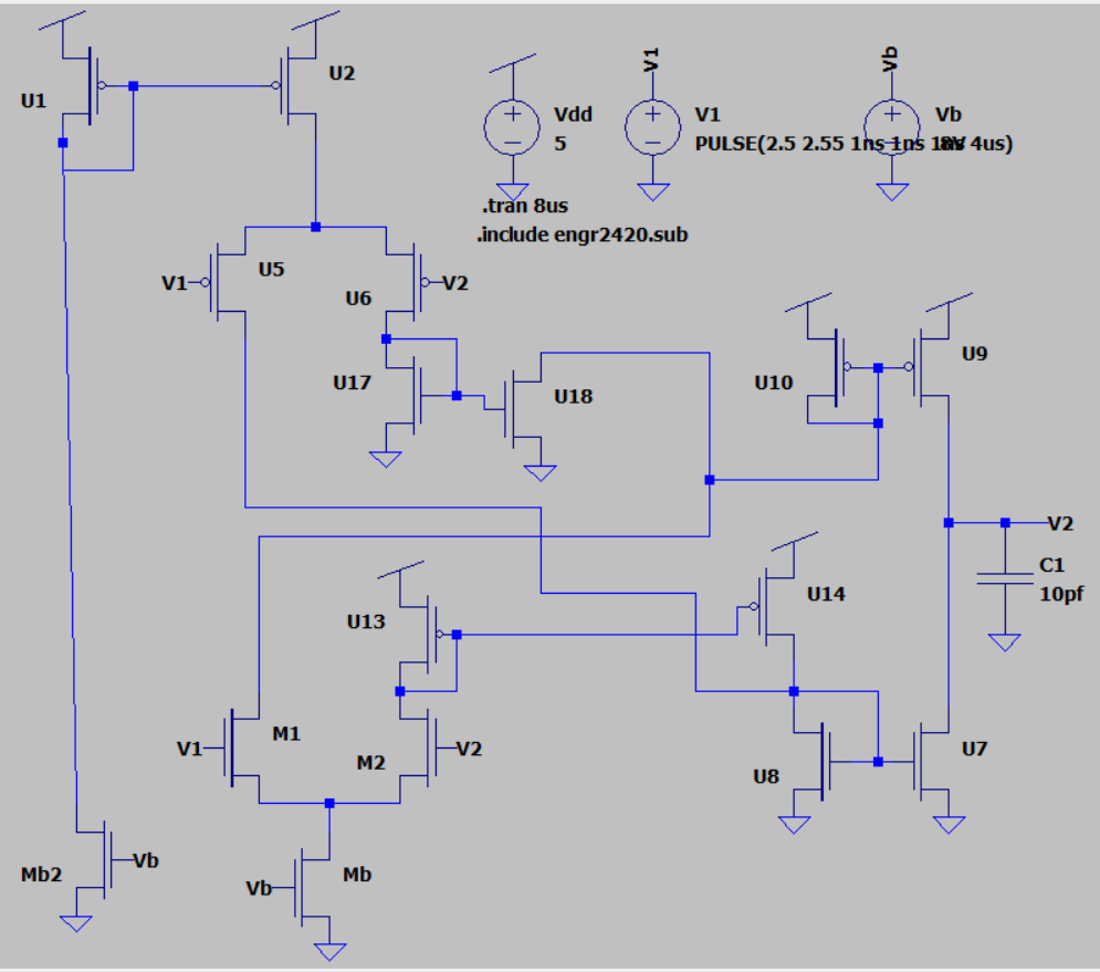 To begin, a simplified current-mirror differential amplifier was studied and tested to determine input and gate characteristics, differential mode voltage gain and the frequency response of the system. The experiments were run on a hardware setup and analyzed in MATLAB. After, a new current-mirror differential amplifier was designed and tested in LT Spice. This new amplifier was designed to have an input voltage that could operate anywhere in the rail-to-rail voltage range. A combination of both nMOS and pMOS transistors were used in order to keep the transistors operating in saturation mode at any given input voltage.
